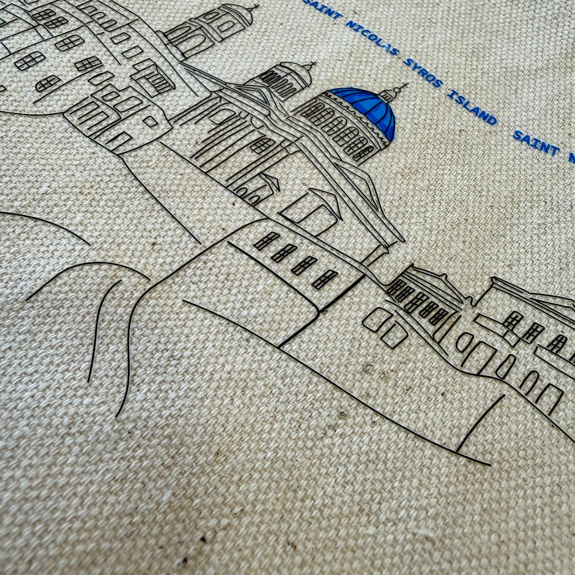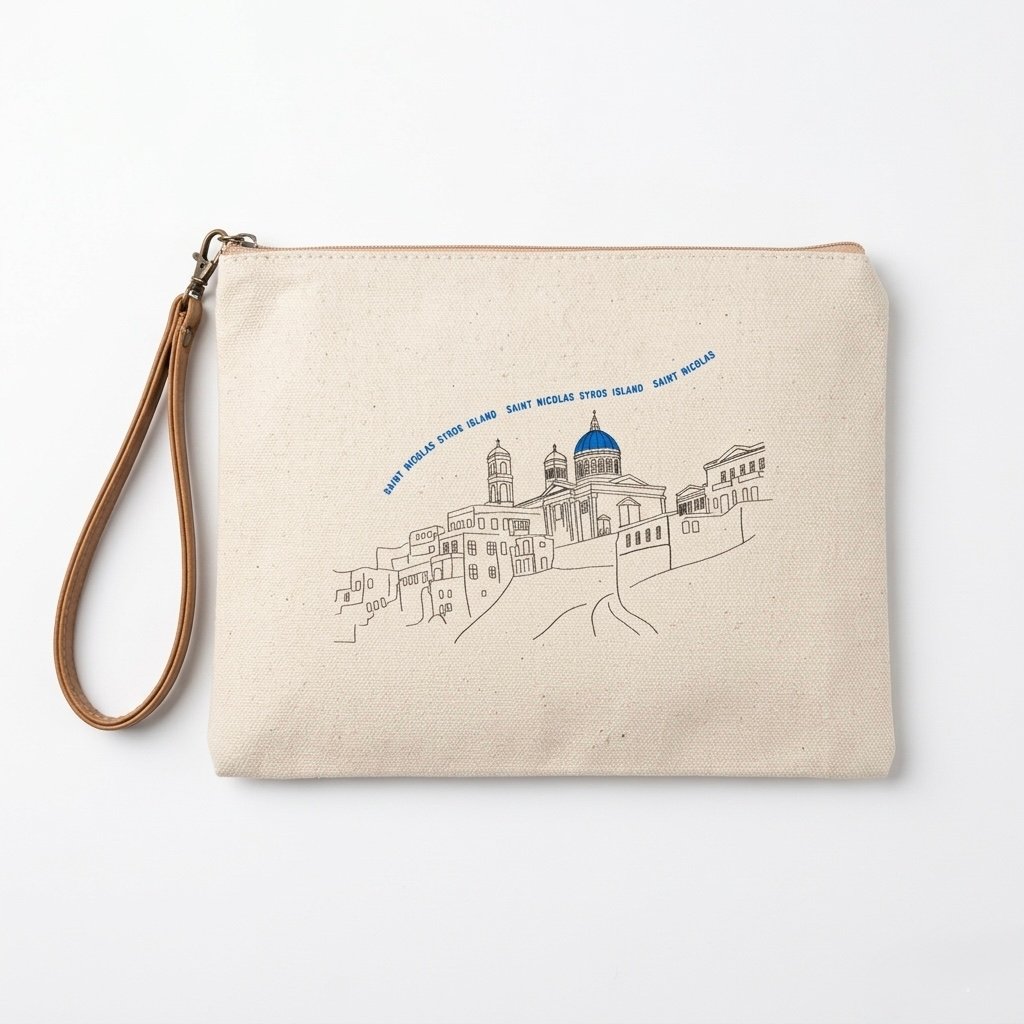 Η πιο αριστοκρατική γωνιά της Ερμούπολης σε ένα κομψό και χρηστικό αξεσουάρ. Αυτό το βαμβακερό νεσεσέρ απεικονίζει τον επιβλητικό ναό του Αγίου Νικολάου και την ιστορική συνοικία Βαπόρια. Ένα πρωτότυπο σχέδιο της σειράς μας, ιδανικό για να οργανώσετε τα καλλυντικά σας ή να το χρησιμοποιήσετε ως ένα ιδιαίτερο clutch bag στις καλοκαιρινές σας βόλτες.