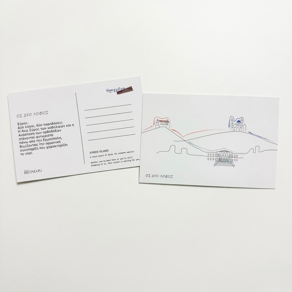 Αυτή η καρτ ποστάλ αποτυπώνει τη μοναδική ταυτότητα της Σύρου μέσα από το σχέδιο "Syros Hills". Απεικονίζει τον καθολικό λόφο της Άνω Σύρου και τον ορθόδοξο λόφο της Ανάστασης, με το εμβληματικό Δημαρχείο της Ερμούπολης να δεσπόζει στο κέντρο. Ένα σχέδιο που υμνεί την αρμονία και την αρχιτεκτονική ομορφιά της πρωτεύουσας των Κυκλάδων.