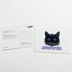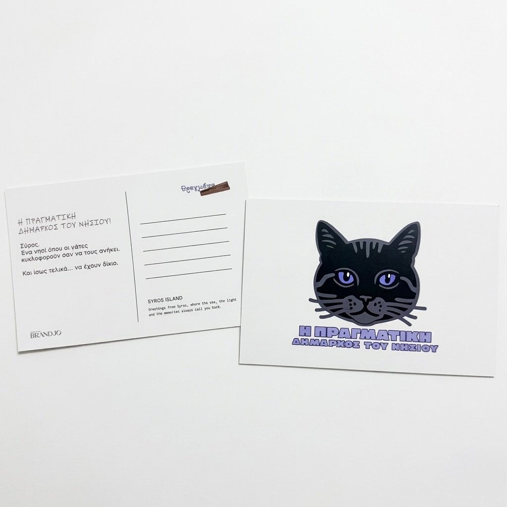 Αυτή η καρτ ποστάλ αποκαλύπτει με χιούμορ την αλήθεια: η μαύρη γάτα είναι η "πραγματική δήμαρχος του νησιού". Ένα μίνιμαλ σχέδιο που αποτίει φόρο τιμής στις τετράποδες κυρίαρχες της Ερμούπολης και της Άνω Σύρου.