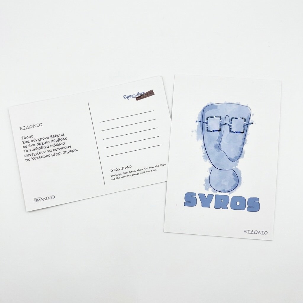 Αυτή η καρτ ποστάλ επαναπροσδιορίζει το εμβληματικό Κυκλαδίτικο Ειδώλιο, προσδίδοντας μια μοντέρνα και "δροσερή" αισθητική σε ένα από τα πιο αναγνωρίσιμα σύμβολα του παγκόσμιου πολιτισμού. Μια γέφυρα ανάμεσα στο χθες και το σήμερα των Κυκλάδων.