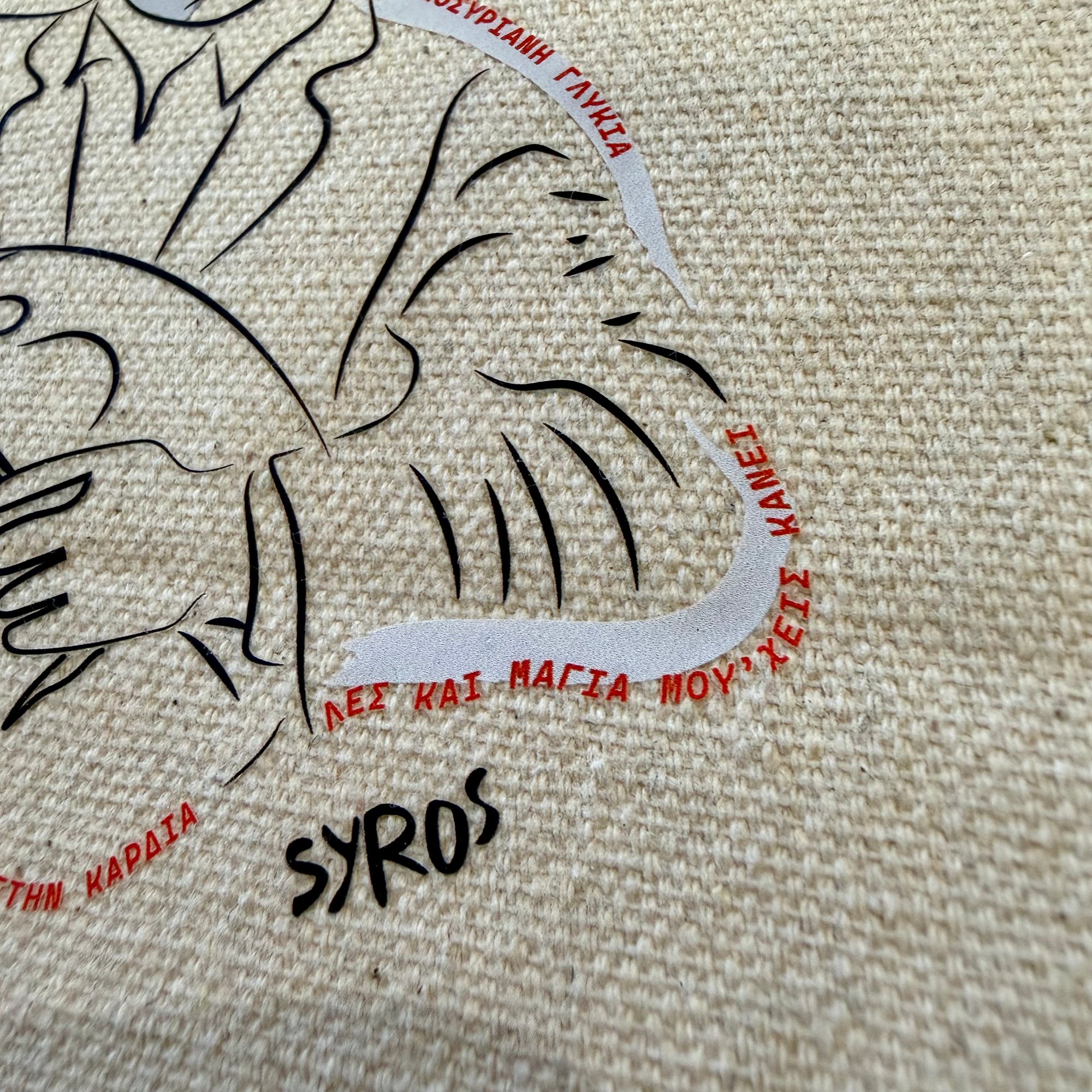 Η μορφή του «Πατριάρχη» του ρεμπέτικου σε ένα αξεσουάρ γεμάτο ιστορία. Αυτό το βαμβακερό νεσεσέρ φιλοξενεί το πορτρέτο του Μάρκου Βαμβακάρη, ενώ περιμετρικά αναγράφονται με κόκκινα γράμματα οι εμβληματικοί στίχοι: «Λες και μάγια μου 'χεις κάνει, Φραγκοσυριανή γλυκιά». Ένα αυθεντικό σχέδιο της Βρεγμένης Σανίδας που τιμά τη μουσική παράδοση της Σύρου, ιδανικό για την οργάνωση των προσωπικών σας αντικειμένων με στυλ.