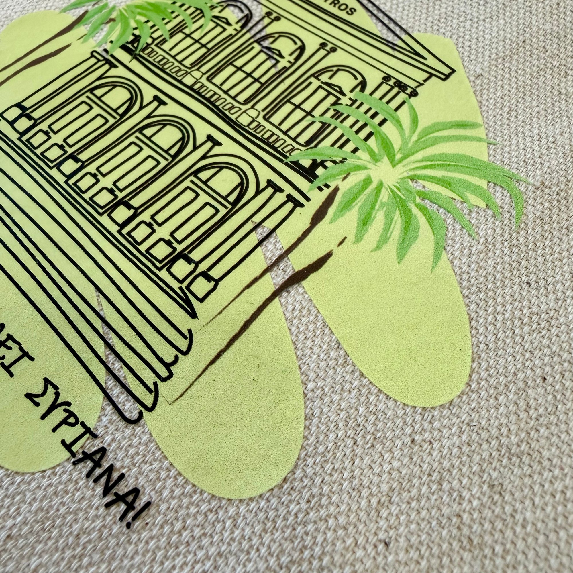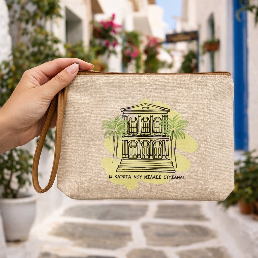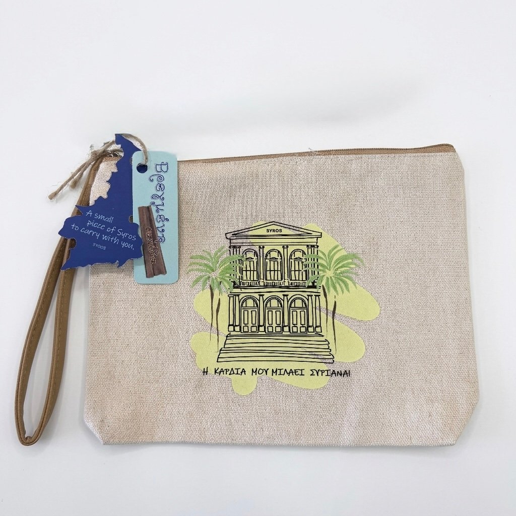 Η επιβλητική αρχιτεκτονική της Σύρου σε ένα κομψό αξεσουάρ. Αυτό το βαμβακερό νεσεσέρ απεικονίζει το εμβληματικό Δημαρχείο της Ερμούπολης, ένα από τα ομορφότερα νεοκλασικά κτίρια της Ελλάδας. Το πρωτότυπο γραμμικό σχέδιο της Βρεγμένης Σανίδας αναδεικνύει τις λεπτομέρειες του κτιρίου, κάνοντας το νεσεσέρ αυτό την ιδανική επιλογή για όσους αγαπούν την ιστορία και την αισθητική του νησιού.